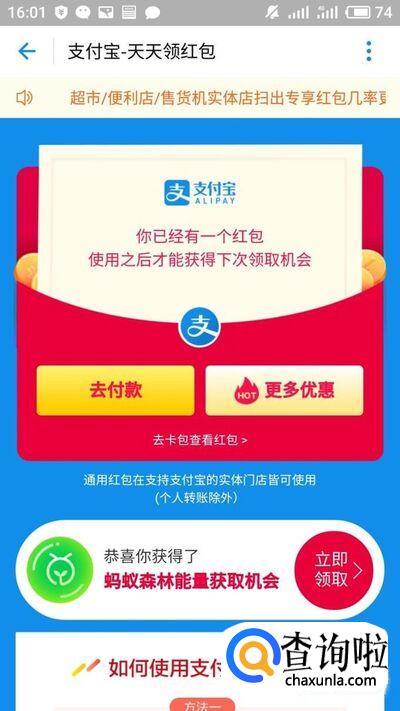 扫取红包码之后就可以领取支付宝的免费红包,领取之后在支付时就可以抵扣了。