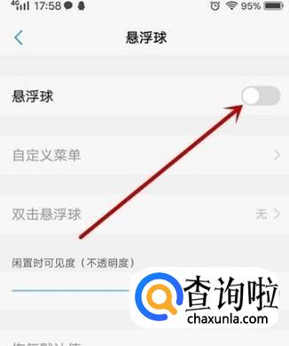 进入悬浮球界面之后,点击图示位置的小滑块即可将其打开,如图所示。