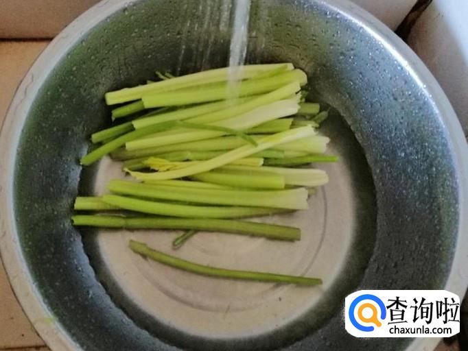 把摘好的芹菜用清水洗净,放在菜板上,然后把芹菜切成一寸长短的芹菜段,放入盘中待用,这里全用的是芹菜杆。