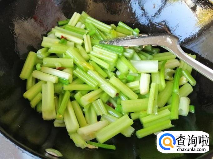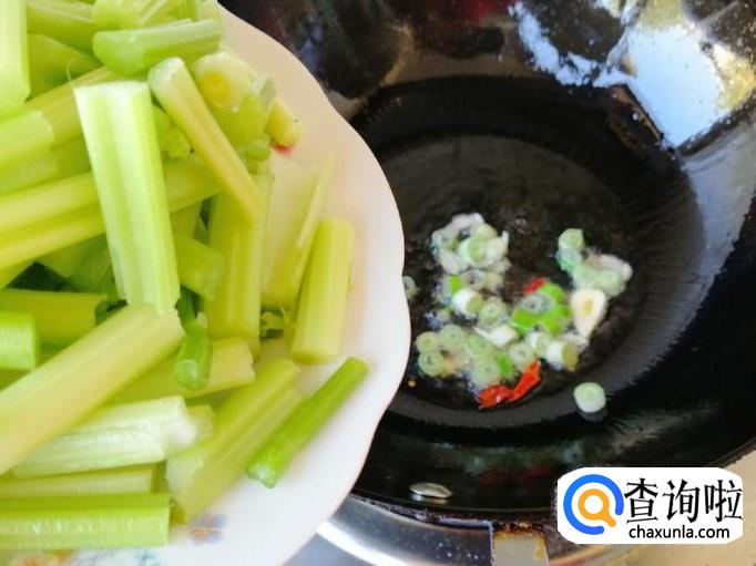 炒锅放油,葱蒜辣椒炒出香味后放入芹菜段,快速进行翻炒,炒芹菜最好是大火快炒,这样炒出来的芹菜会比较绿。