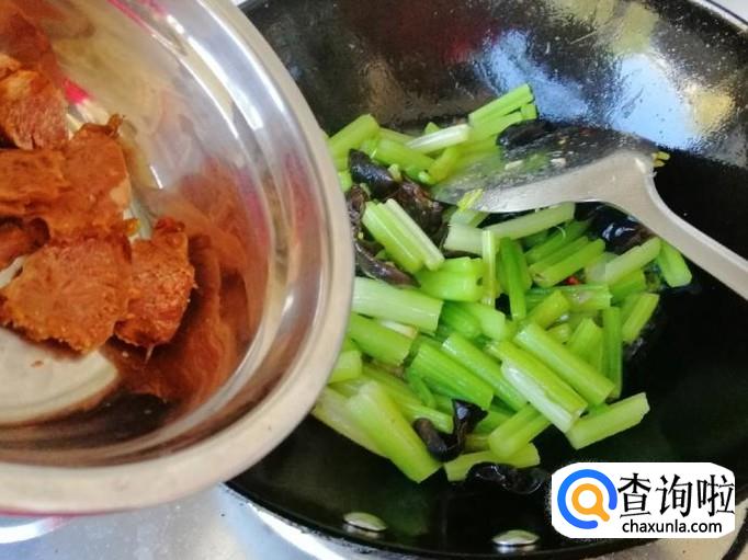 因为是熟牛肉,最后加上翻炒均匀就可以了,这时我们就可以看到芹菜木耳,已经明显变软,说明菜已经熟了,不确定的可以尝一下。