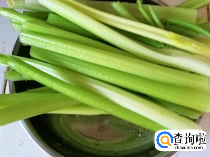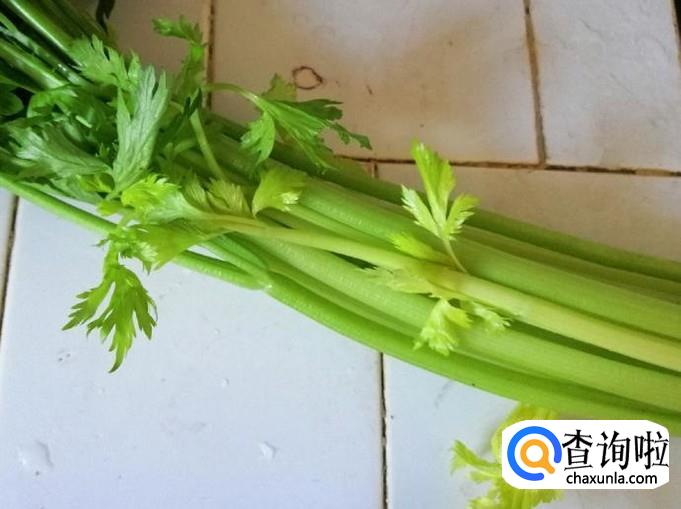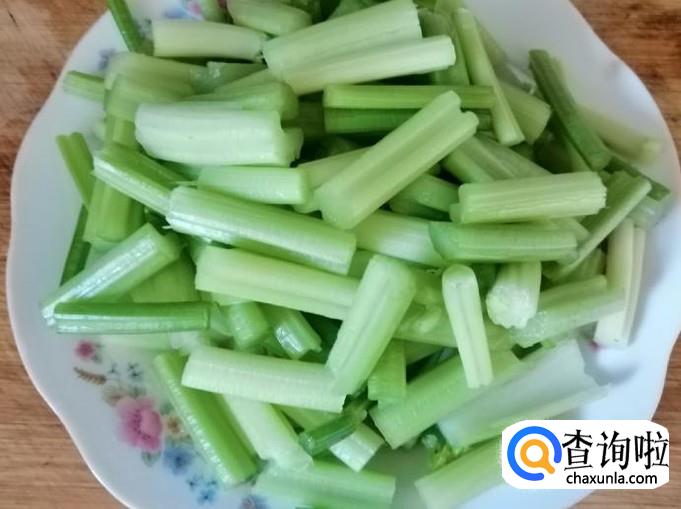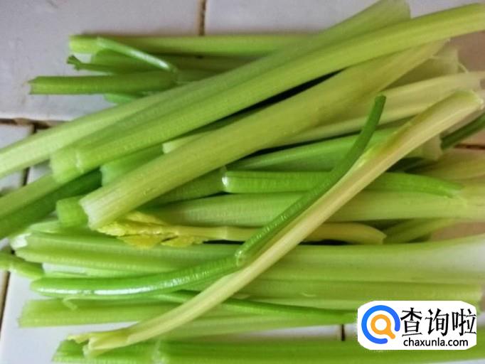取两三颗芹菜,先摘掉芹菜叶子,然后把芹菜去根、分段抽去芹菜丝,挑好鲜嫩可以食用的芹菜段。