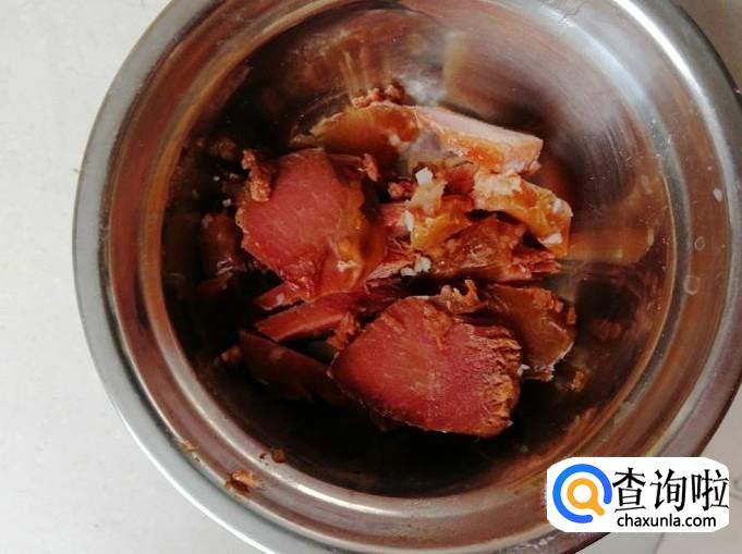 取一小块熟牛肉,切成片装入容器中待用。没有熟肉的可以用生肉洗净切好,要用生肉时,记得先炒肉后放菜。