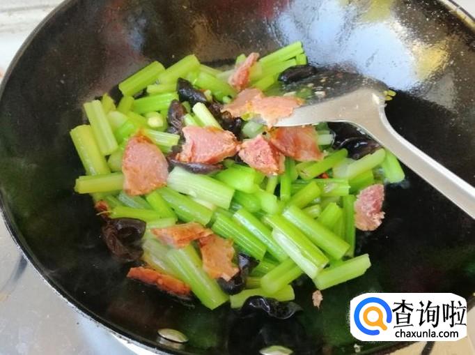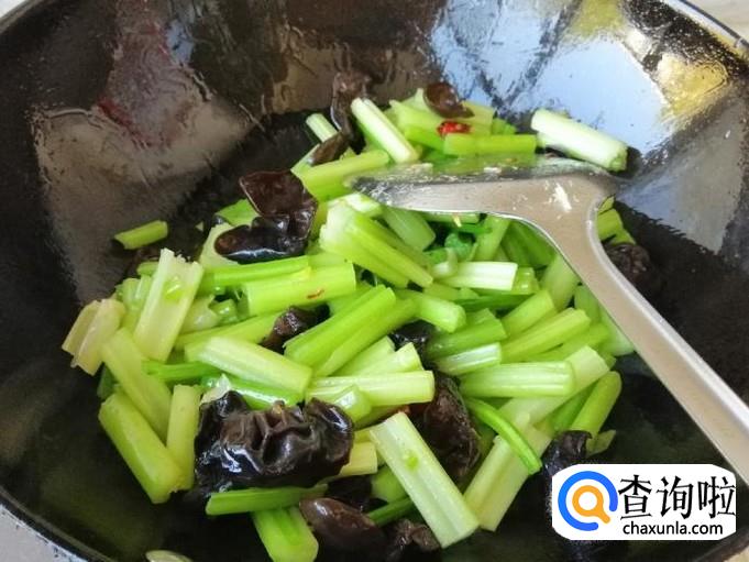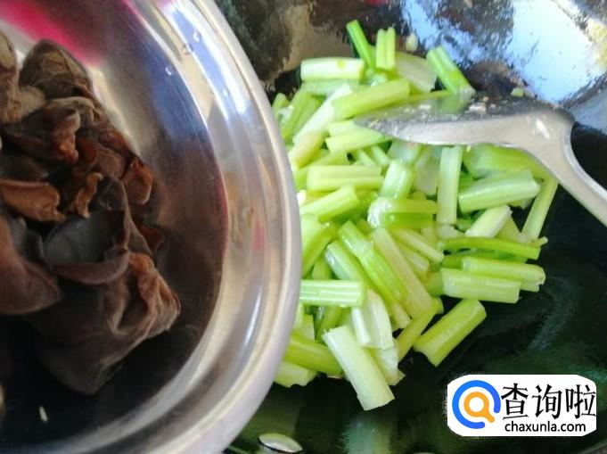 芹菜断生后放入备好的木耳,继续用铲子翻炒片刻,芹菜比较老的话这时,可以适量加一的热水。