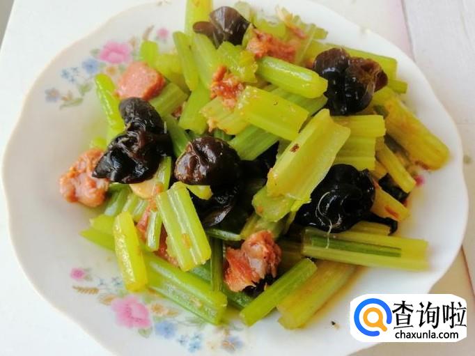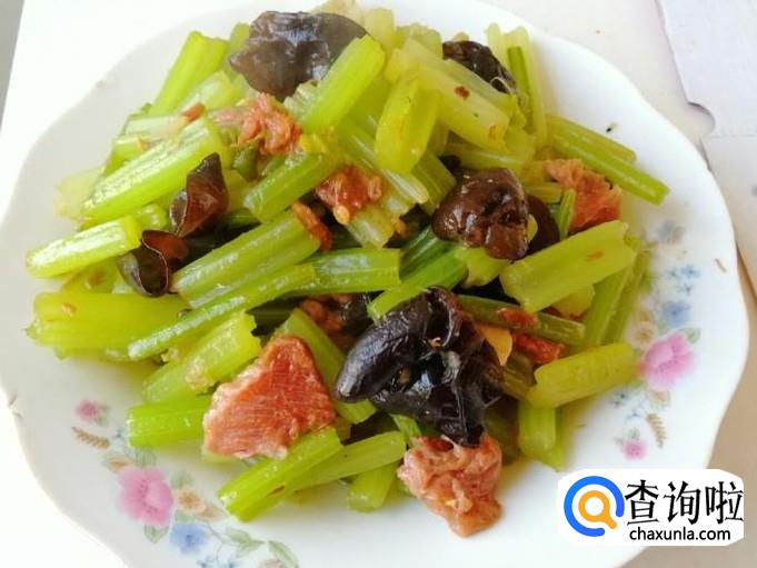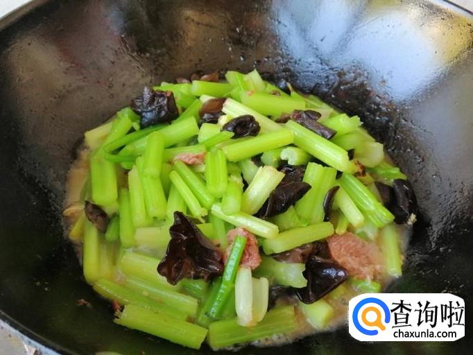 如图所示芹菜木耳炒肉已做好了,加入适量生抽和适量食盐,翻炒均匀关火,芹菜木耳炒肉出锅入盘就OK了。