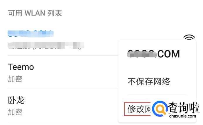 找到自己连接的wifi,长按后选择修改网络。如果右边有按钮的可以直接点击按钮也行。