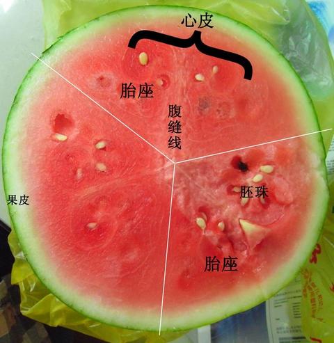 这是一个西瓜的横切,已经标注出了各部分的名称。西瓜的中心其实是三个心皮联合的地方,因此很少有维管束,也不会有种子,所以质地较为均一,咬起来很爽快。