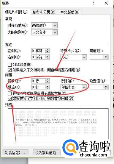 将段前段后的间距更改为“0行”,将行间距更改为“单倍行距”,勾选“如果定义了文档网络,则对齐到网格”,编辑完成后点击“确定”即可。