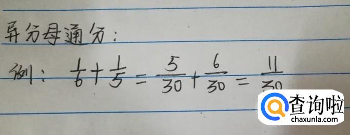 如图所示,当两个分母之间没有倍数关系时,重要的是去找两个分母的最小公倍数,六和五的最小公倍数是30,六分之一分母变为30需要乘以5,所以为了是整个分式值不变,分子也要乘以5,同理,五分之一的分母5乘以6得到30,所以分母乘以6,最后相加得到三十分十一