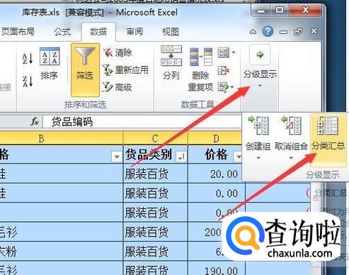 将表格选中,再点击数据选项卡。在功能区中点击分级显示,再点击分类汇总。