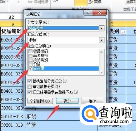 弹出分类汇总对话框,选择分类字段,汇总方式,汇总项,按确定。