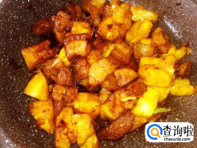 猪肉200克,菠萝300克,姜蓉、蒜米适量,生抽、料酒、老抽适量。