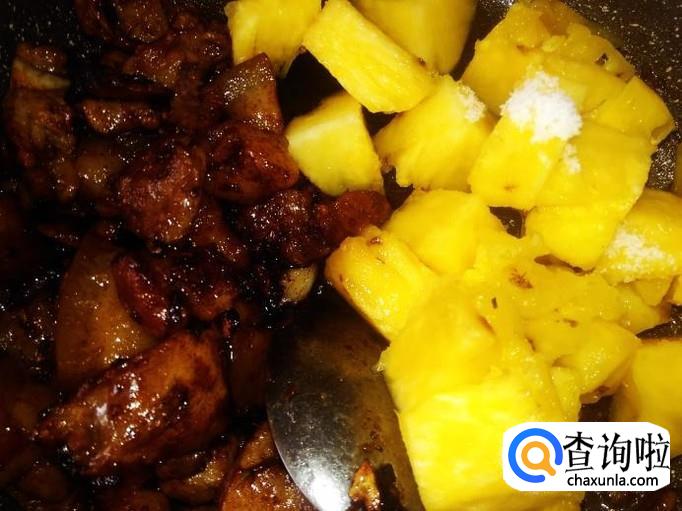 然后打开锅盖翻炒一下,铲到锅边,再下菠萝进去,加适量的盐煸炒一下。