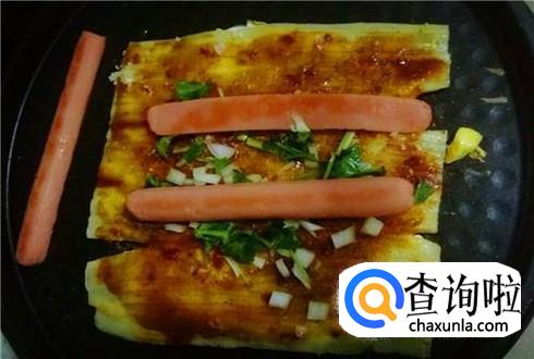 香肠放在锅的边上一起煎着,冷面上的鸡蛋固定之后翻一下,然后用刷子刷一层辣酱在冷面上,撒上一层小葱,将香肠放在冷面上。