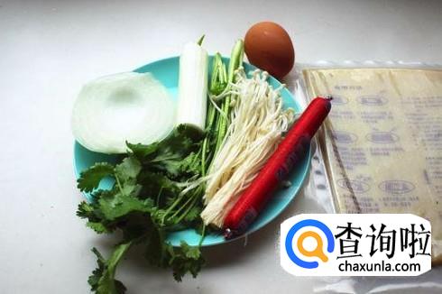 烤冷面所用的食材其实很简单的,冷面,鸡蛋,香肠,生菜,小葱,小葱香菜清洗干净待用。喜欢吃金针菇的,可是放上一把金针菇,味道也不错,我不喜欢吃所以今天咱就不放金针菇了哈。