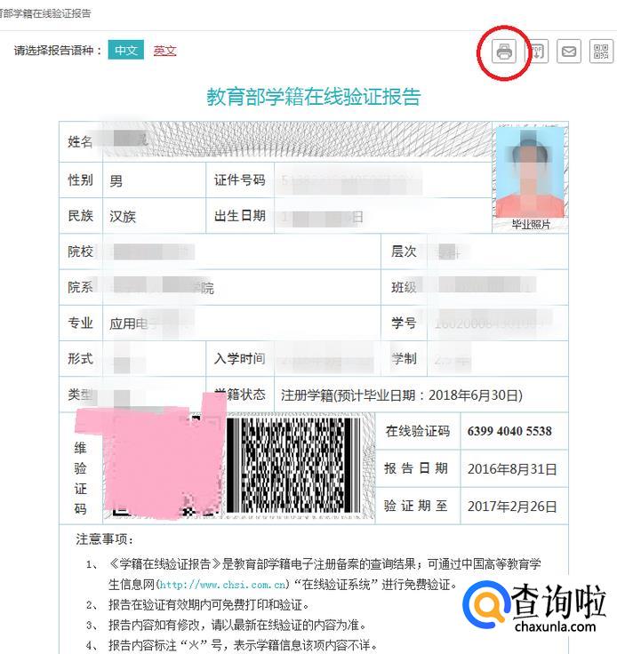 进入界面,就可以查看自己学籍在线验证报告了,点击右上方的打印即可,如图所示。