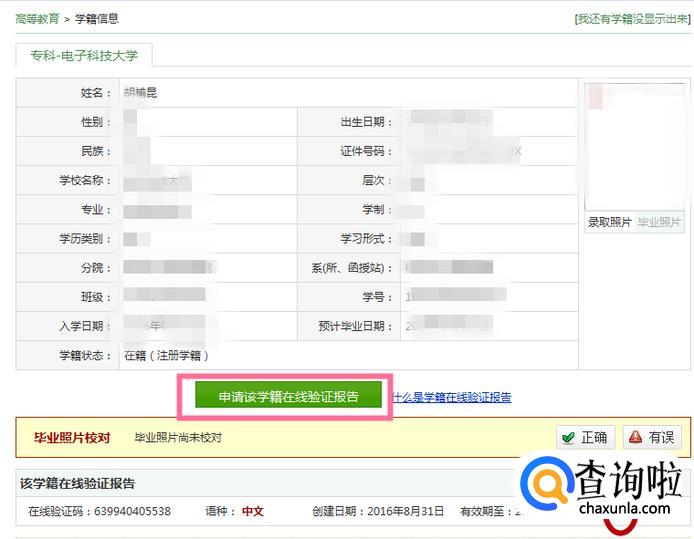 进入界面,就会显示你的学籍信息了。如果你以前没有申请学籍在线验证报告的话,你就需要点击进入,看你现在申请到多久的时间而判断你支付多少钱(可以支付宝付款这些)。反正不贵的一个月也就两元钱。这里我是付过钱的了,直接点击下方的查看即可。