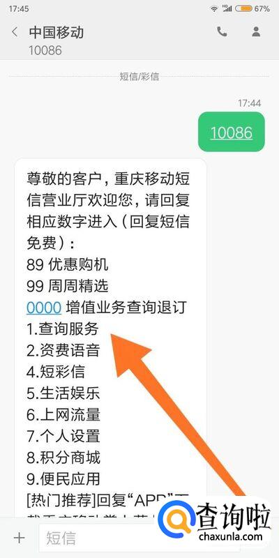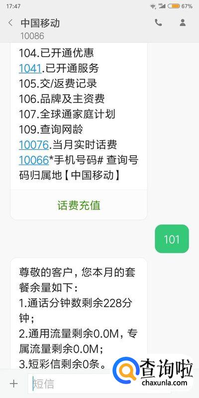 接下来根据中国移动短信内容提醒,回复数字即可查询到流量使用情况。