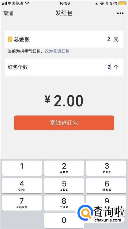 接着输入你的红包金额和红包个数并点击塞进红包,如下图所示。
