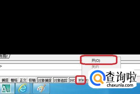 然后,如图所示,右键单击“DYN”标签(当前是凸起状态,直接左键点击是不行的),点击“开”,就可以打开动态输入了。