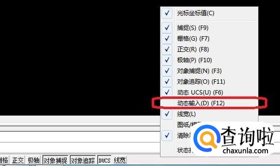 右键点击屏幕底部状态栏空白处,如图所示,把“动态输入”的复选框勾选上,使状态栏显示“动态输入”(DYN)命令。
