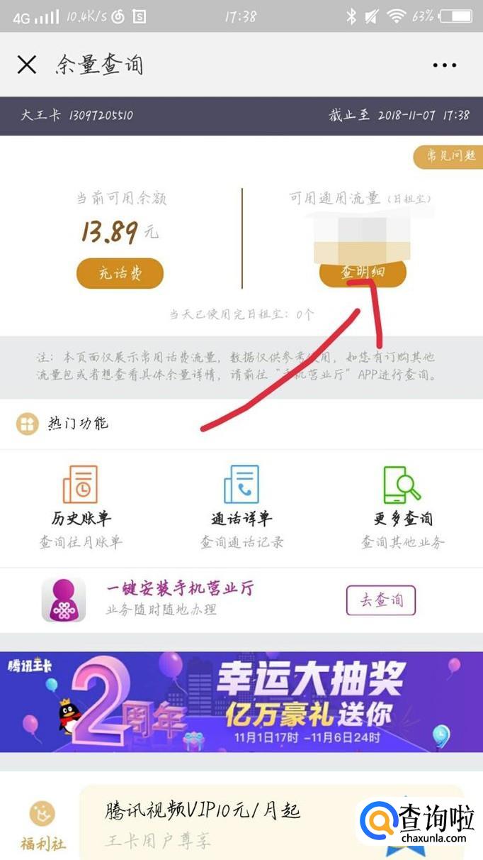 会出现一个新的界面,点击“查询”选项,如图1箭头所示。这样你就可以看到自己用了多少流量了。