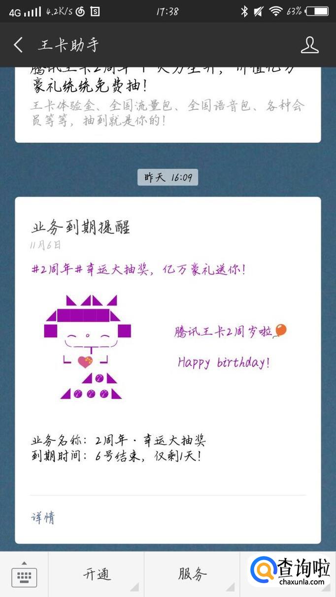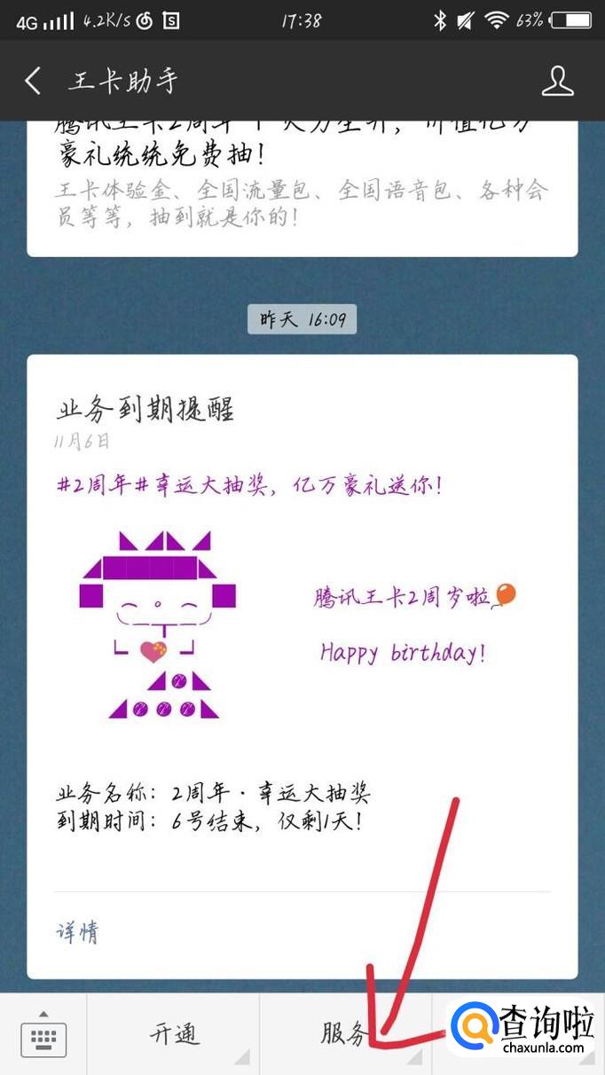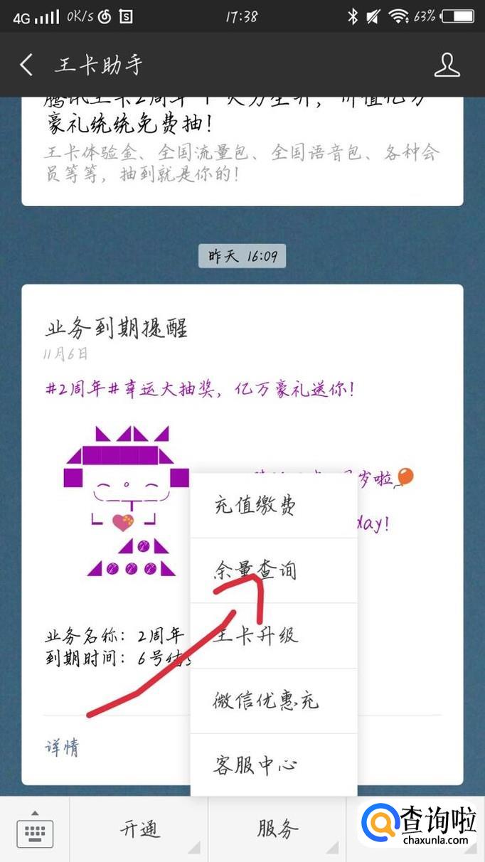 点击最下方那一栏的“服务”选项,如图1箭头所示。会出现一个新的界面,点击“余量查询”如图2箭头所示。