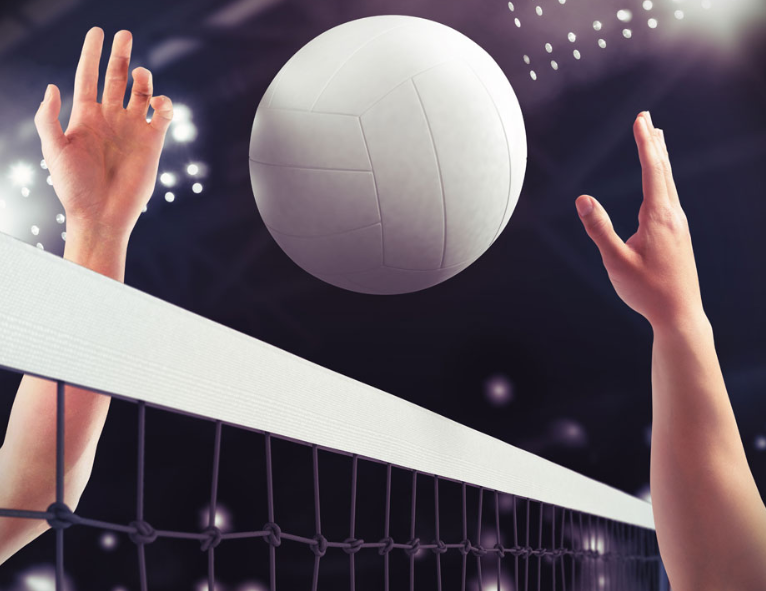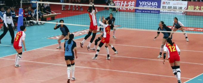 排球(volleyball)是球类运动项目之一,球场长方形,中间隔有高网,比赛双方(每方六人)各占球场的一方,球员用手把球从网上空打来打去。排球运动使用的球,用羊皮或人造革做壳,橡胶做胆,大小和足球相似。
