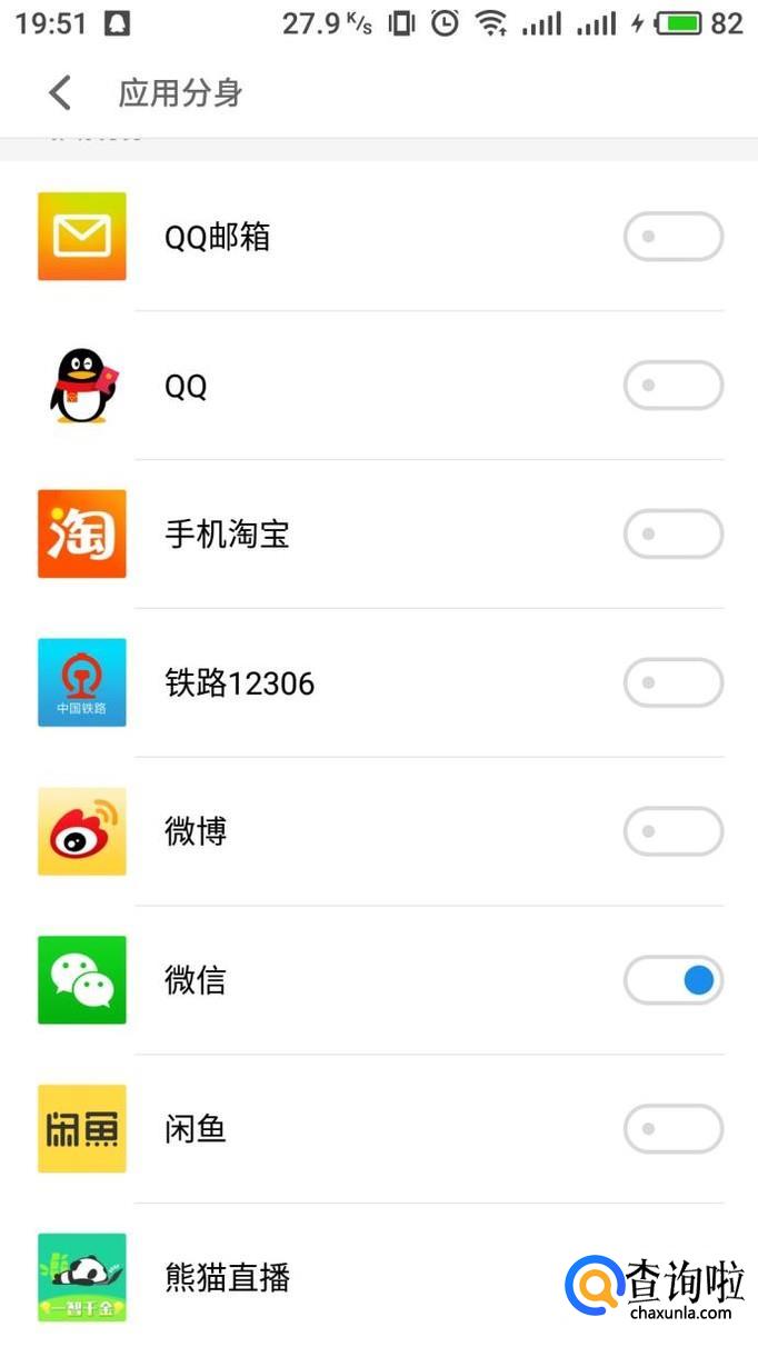 进入应用分身界面,将微信右侧的滑块开启,即可开启微信应用分身。