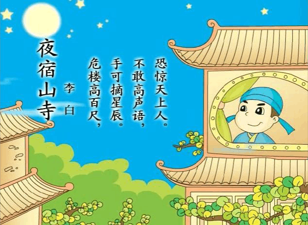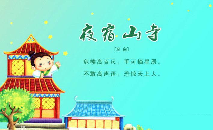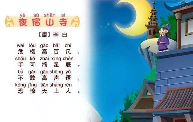《夜宿山寺》这首诗曾被选入小学语文教科书,它是唐代伟大诗人李白的作品。此诗运用了极其夸张的修辞手法,描写了寺中楼宇的高耸,表达了诗人对古代庙宇工程艺术的惊叹以及对神仙般生活的向往和追求之情。全诗语言朴素自然,想象瑰丽,夸张巧妙,活灵活现,给人以丰富的联想和身临其境之感。