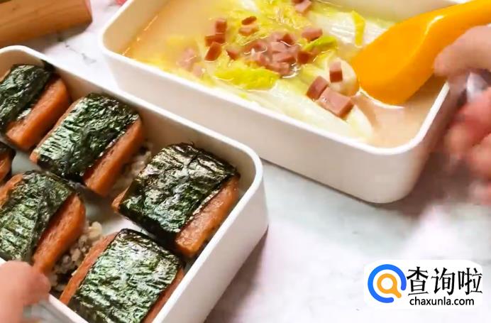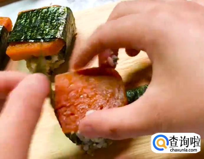 接着放上午餐肉,用海苔包裹严实。如图所示。