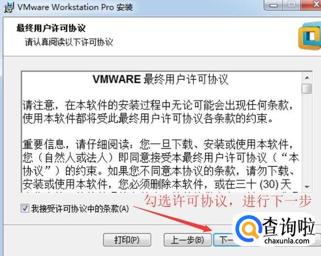 接下来勾选接受许可条款,然后点击下一步按钮,如下图所示