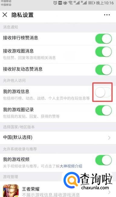 弹出的界面,我们将我的游戏信息的开关向左滑动;