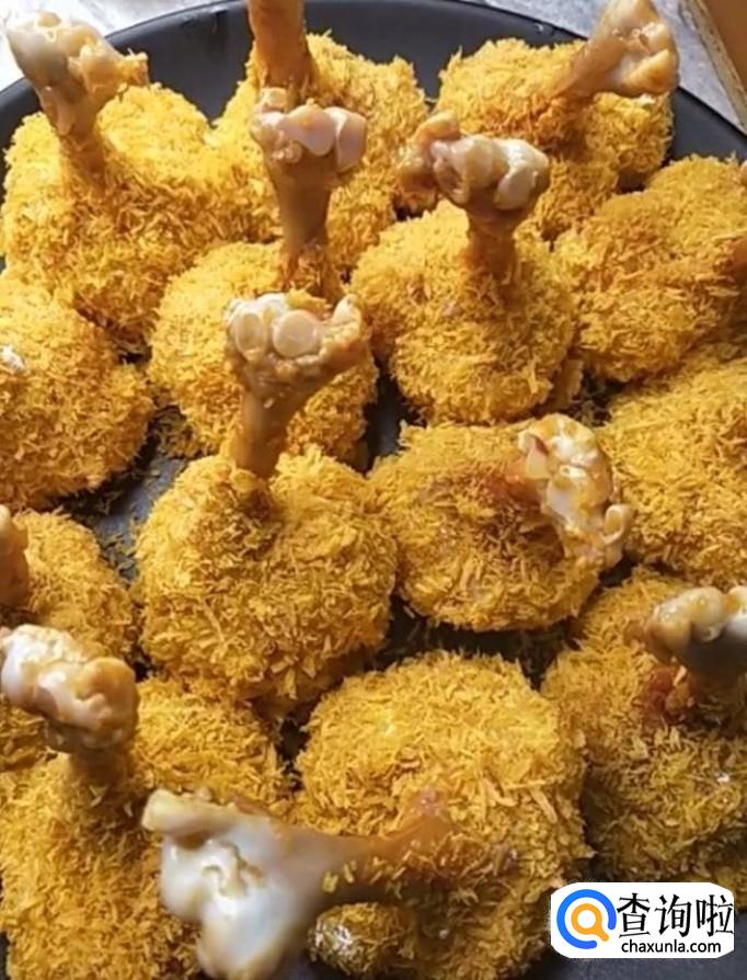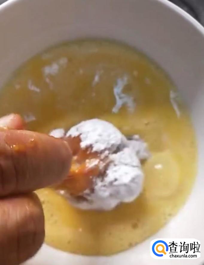 然后我们准备一碗鸡蛋液,一碗淀粉,一碗面包糠,将腌好的鸡腿先裹一层鸡蛋液,再裹一层淀粉,再裹一层鸡蛋液,最后裹一层面包糠,全部做好备用