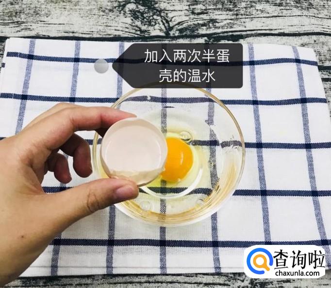 然后在一个容器中打入一颗鸡蛋并加入一倍鸡蛋量的清水,搅拌均匀,如下图所示。