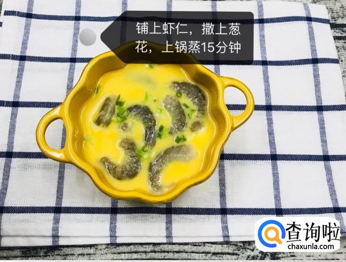 然后把虾仁铺在表面,并撒上葱花上锅蒸15分钟,如下图所示。