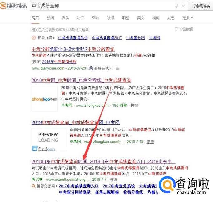 首先用搜狗搜索中考成绩查询,如下图,在下面有一个2018年的成绩查询入口,然后点击进入。