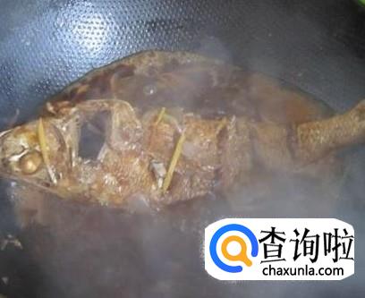 将煎好的鱼放入锅中,将碗中的汁倒在鱼身上,再加入适量的清水,没过鱼身,然后盖上锅盖。锅中的水烧开后,用铲子将汤汁淋在鱼身上,等锅中的汤汁收至很少时,鱼肉也入味了,就可以出锅了。