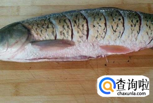 将草鱼,去腮,去鳞,用水清洗干净,用刀在鱼背上切几刀,切开鱼肉,便于入味,再准备葱、姜、蒜。