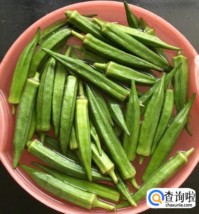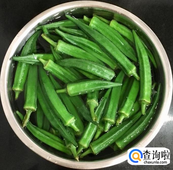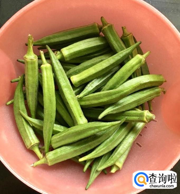 新鲜的秋葵500克左右放入容器中,加入适量的盐和清水反复搓洗一下表面的绒毛,沥干水分备用