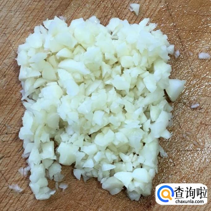 大蒜根据自己的喜好来定量,剥去外皮清洗干净后剁成蒜末备好。