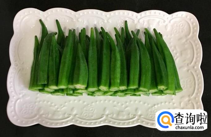 焯过水并凉透的秋葵沥干水分把蒂切掉,整齐的摆放在盘中备用