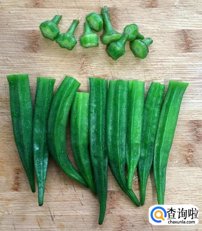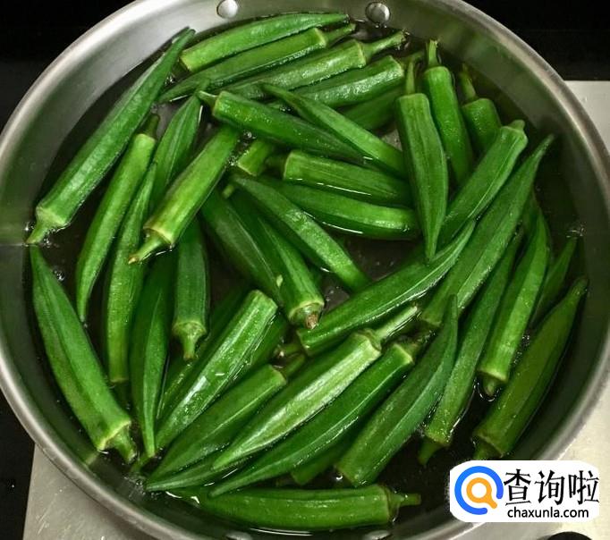 锅中加水煮沸后放入秋葵焯水一分半钟,捞出用凉水反复冲洗过凉。为了防止秋葵的粘液流出焯水时不要把蒂切掉。