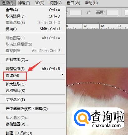 画出选区之后在菜单里找到选择选项,点击该选项在其内找到修改选项,如图所示: