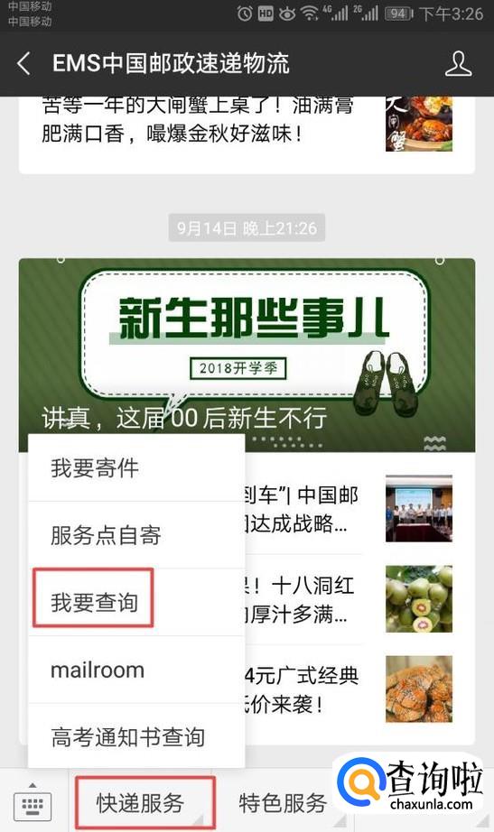 弹出的界面,我们点击快递服务,然后我们点击我要查询;