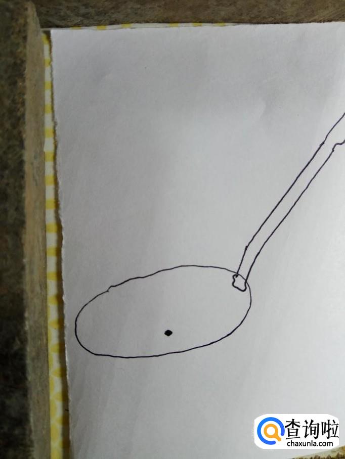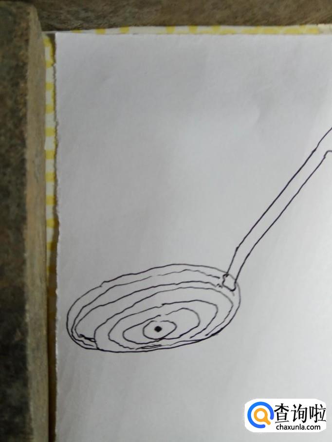 找到笊篱头部的中心位置,用一个小圆点来表示,因为是立体图形,所以小圆点并不在椭圆形的中间,而是稍向下偏一些。