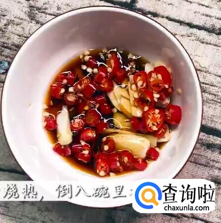 取一个小碗,放入盐、鸡精、辣椒、蒜片、白醋、生抽,倒入热油,搅拌均匀。