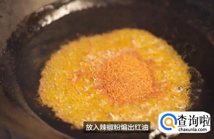 然后做调味酱汁:锅中油烧热,待锅边缘略微起烟,调小火,放入辣椒粉煸出红油,再放入花椒粉、孜然粉,煸出香味后,倒入陈醋、老抽和生抽;加入少许凉水,搅拌均匀后,加入糖,煮至酱汁微沸。