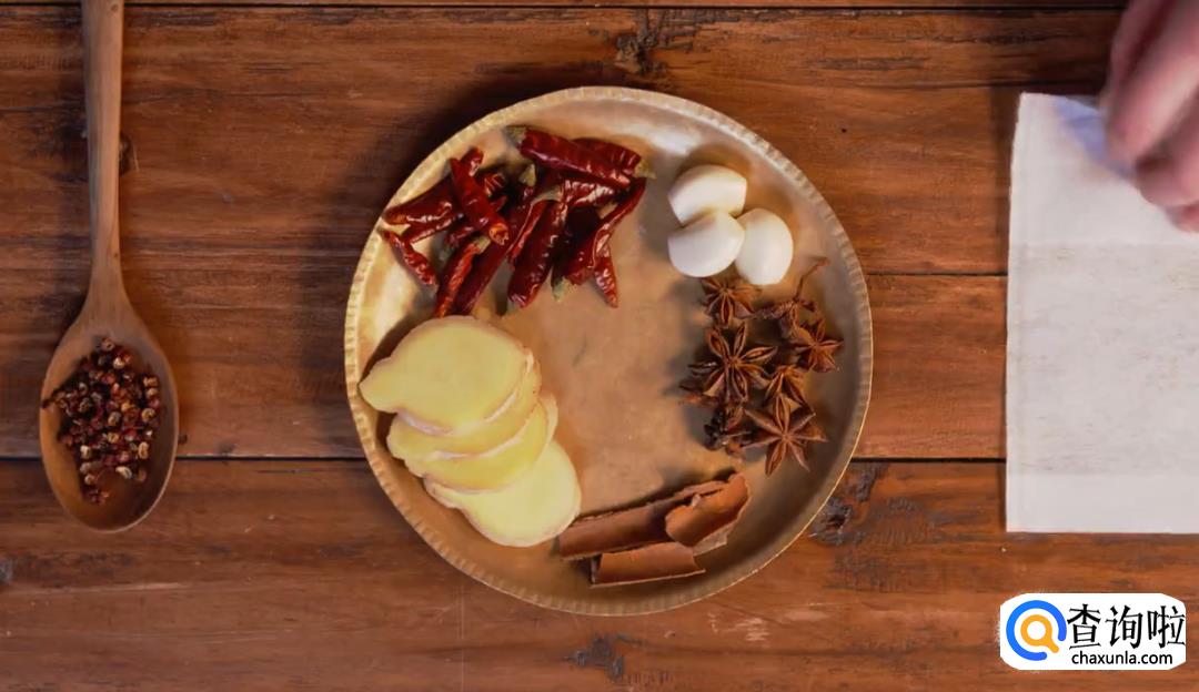 接着,卤牛肉:将八角、桂皮、姜片、干辣椒、蒜瓣、花椒封入料包。