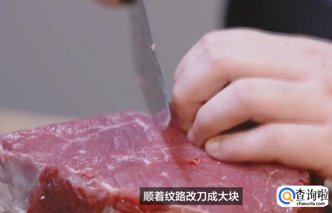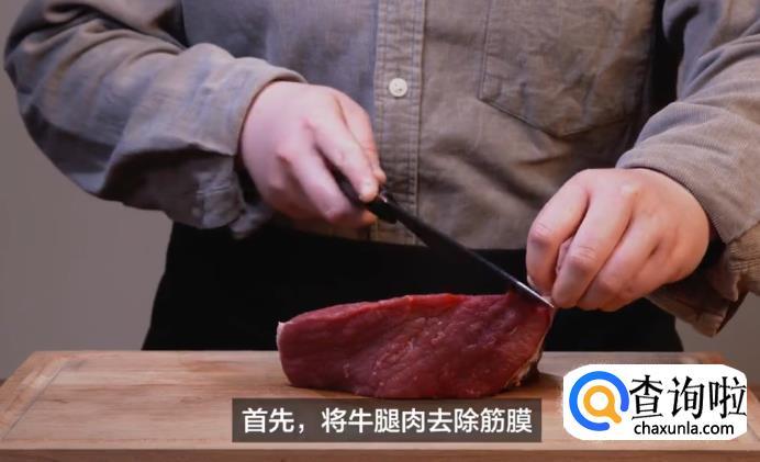 首先,将牛腿肉去除筋膜,顺着纹路改刀成大块(这样切更便于将牛肉手撕成丝)。